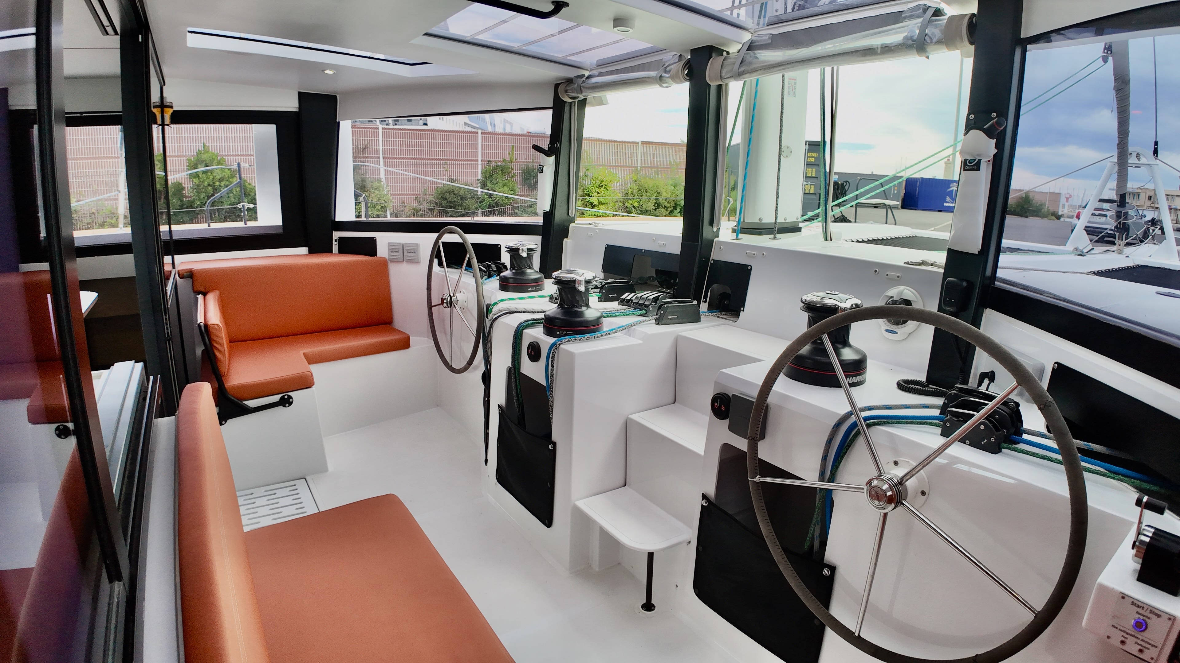 The forward cockpit also gives you direct access to core systems without ever leaving your dry, protected workspace. Everything is centralized, so checking battery and solar charging status, toggling between navigation systems, and even turning lights on and off throughout the boat, becomes a seamless part of your everyday flow and rhythm. From evaluating your battery levels heading into an overnight sail and activating hydrogeneration, to transferring fuel and monitoring weather and wind conditions, the information you need is right where you’re already working. It’s a small detail that makes a huge difference, especially when you’re on an offshore passage, on watch, or short-handed: fewer steps, fewer distractions, and a stronger sense of control over the entire boat.